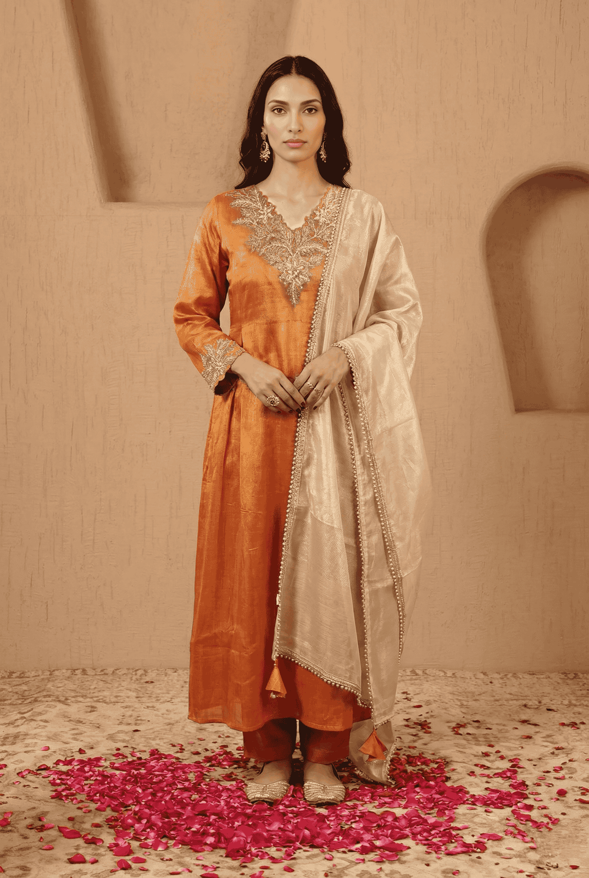 Rooted in warm festive elegance, the Amber Dori Zari Scallop Embroidered Tissue Kurta with Narrow Pants and Dupatta is a refined expression of subtle shimmer and artisanal detailing. This graceful three-piece ensemble is ideal for festive celebrations, intimate weddings, and special occasions, blending traditional craftsmanship with a clean, contemporary silhouette.