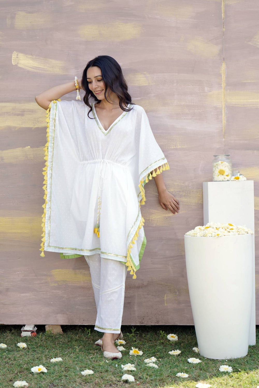 -Kaftan in pure cotton dobby fabric with tie up in the centre to adjust the waist.