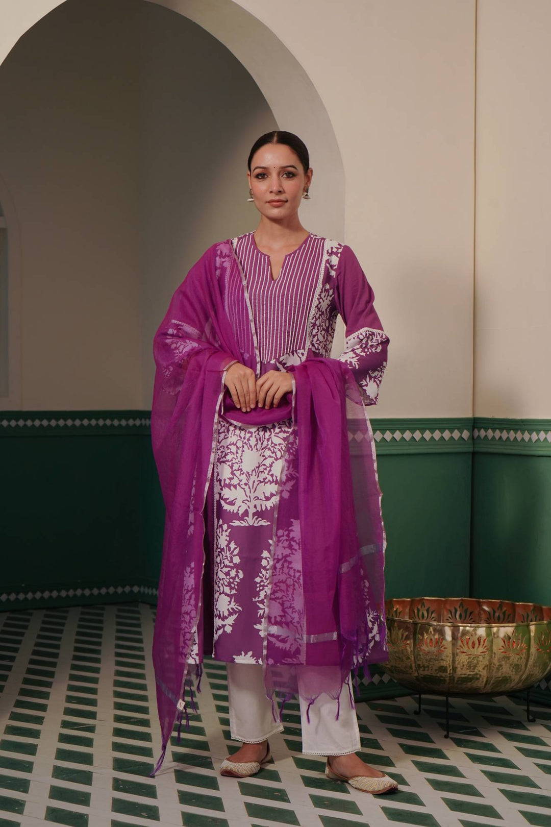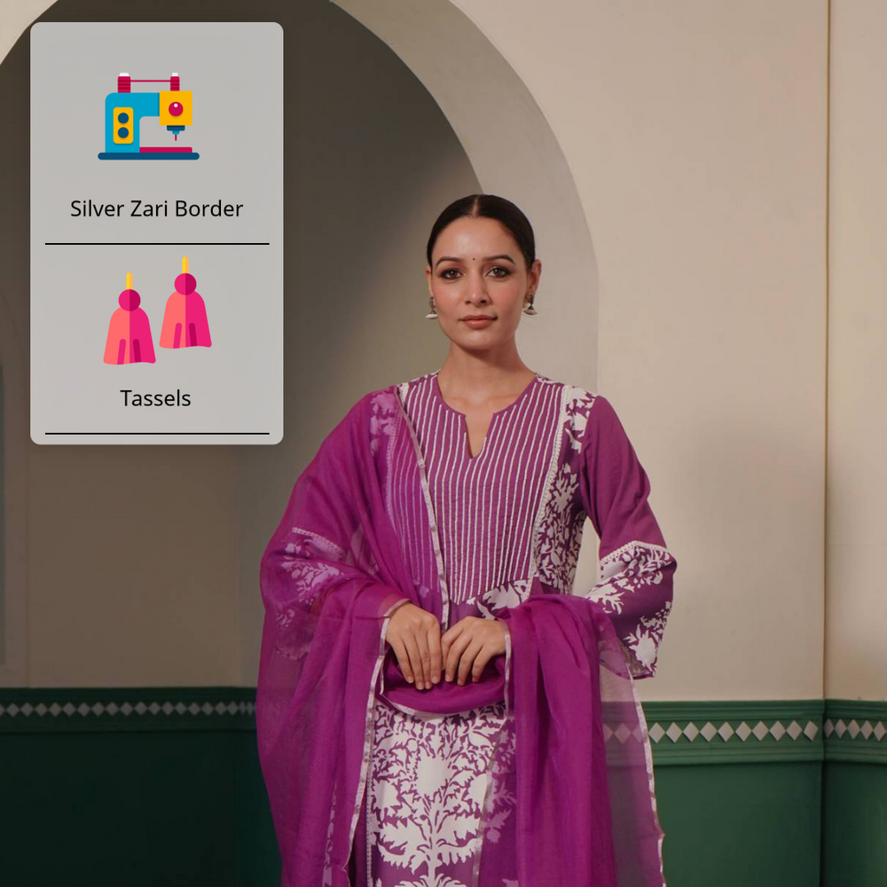 -Kurta in Violet and White Printed Fabric with panelling adding flare to the silhouette.