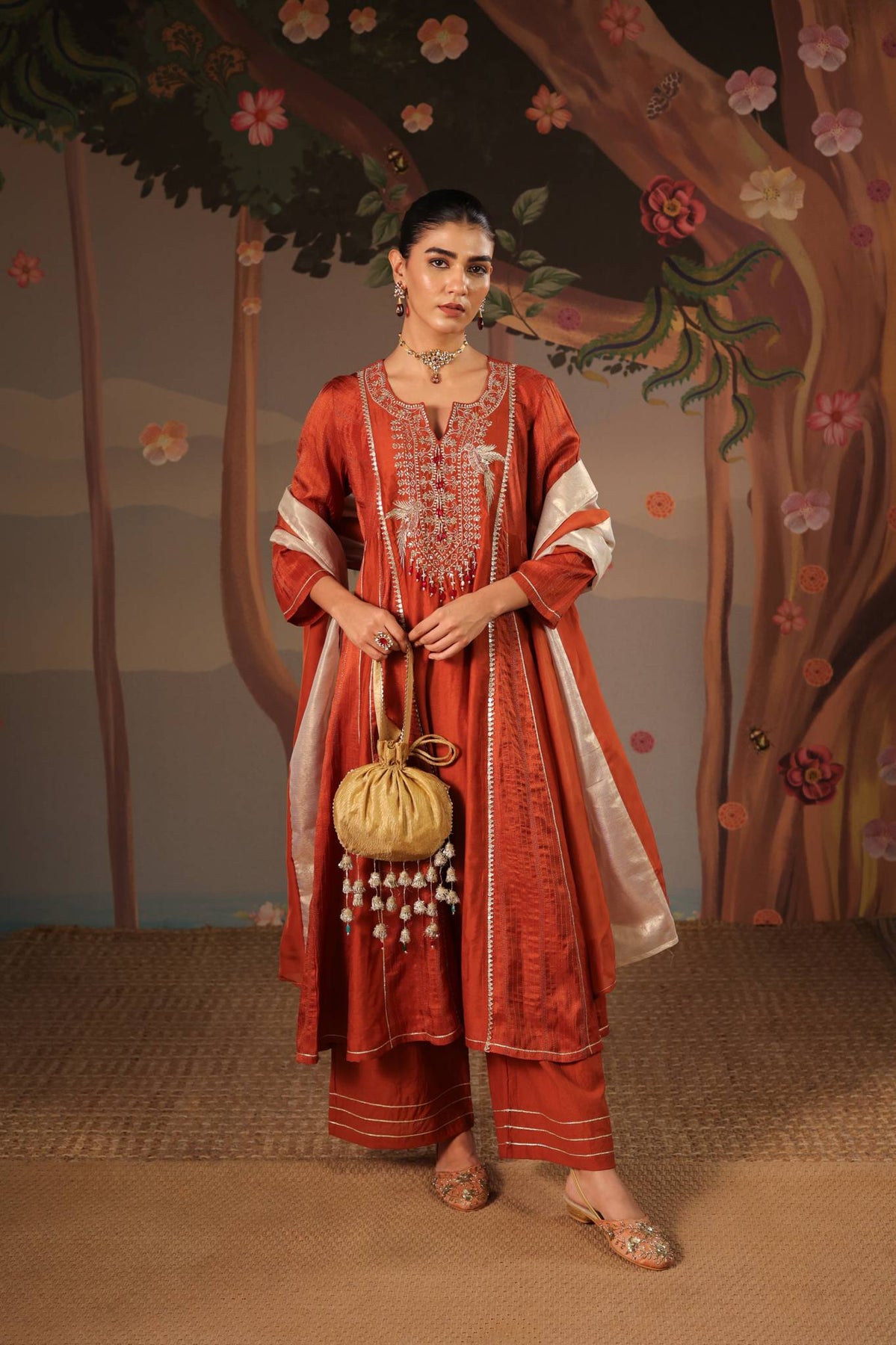 Crafted from luxurious silk chanderi in a rich rustic shade that offers a luminous, festive sheen.