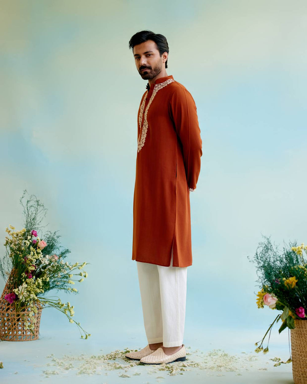-Men's kurta in rust linen georgette fabric with full length sleeves.