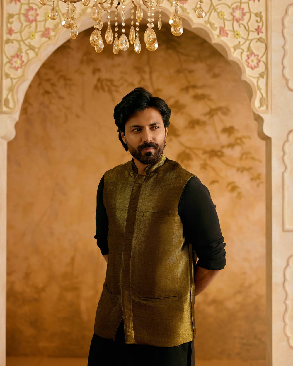 Elevate your wardrobe with this sophisticated Black Chevron Tissue Nehru Jacket,