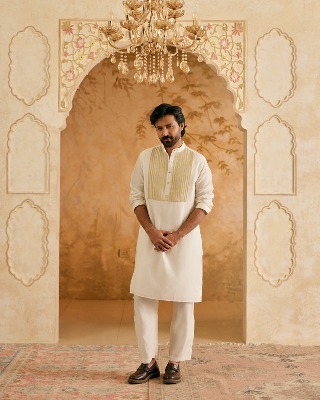 A perfect blend of sophistication and contemporary style, the White Gold Pure Silk Yoke Embroidered Kurta with Narrow Pants for men is designed to make a statement while offering comfort and timeless elegance.