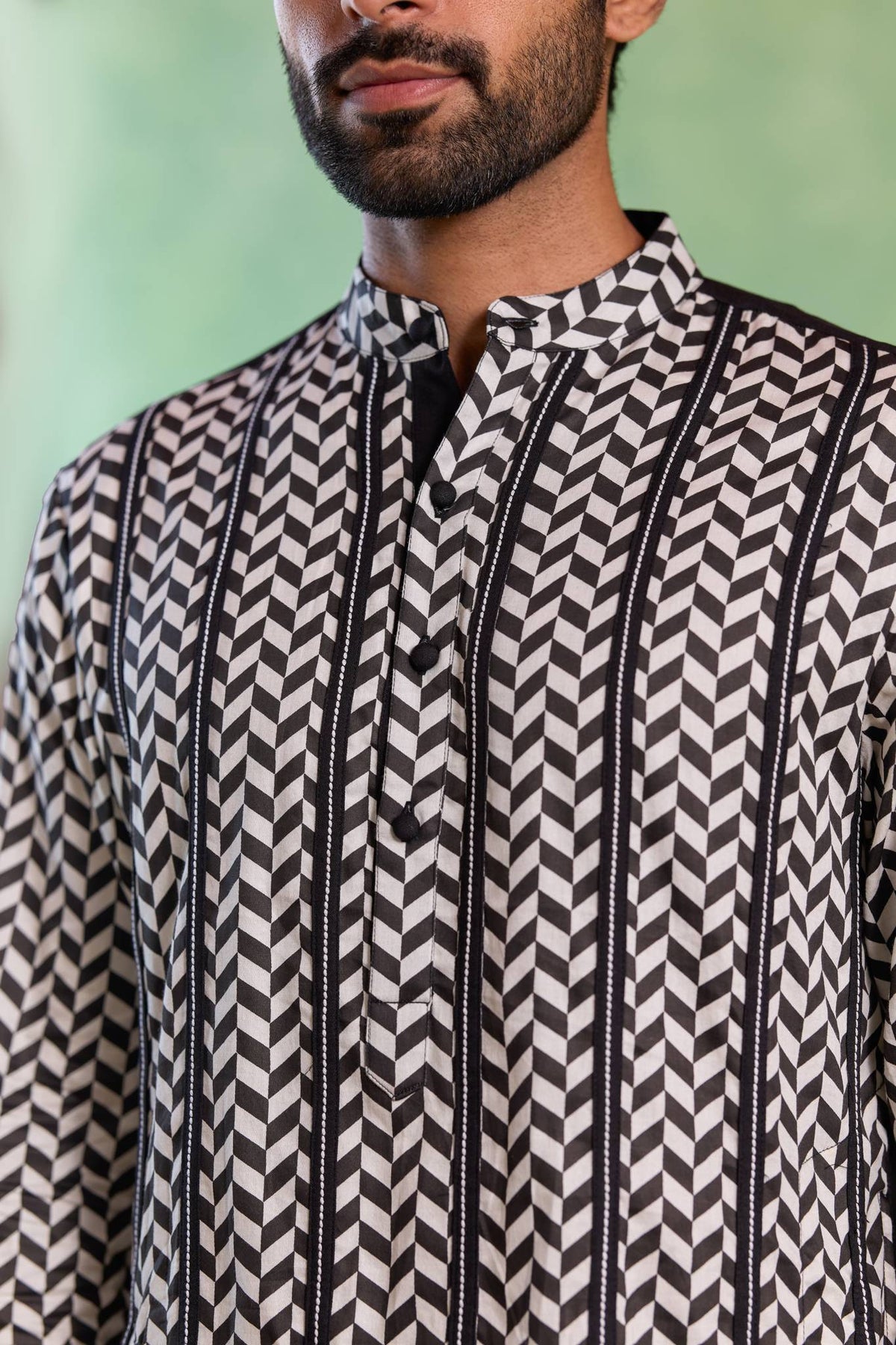 The Black Chevron Embroidered Printed Kurta with Narrow Pants combines graphic chevron prints with intricate embroidery on a rich black canvas. Styled with tonal narrow pants, the ensemble creates a balanced look suited for festive and evening celebrations.