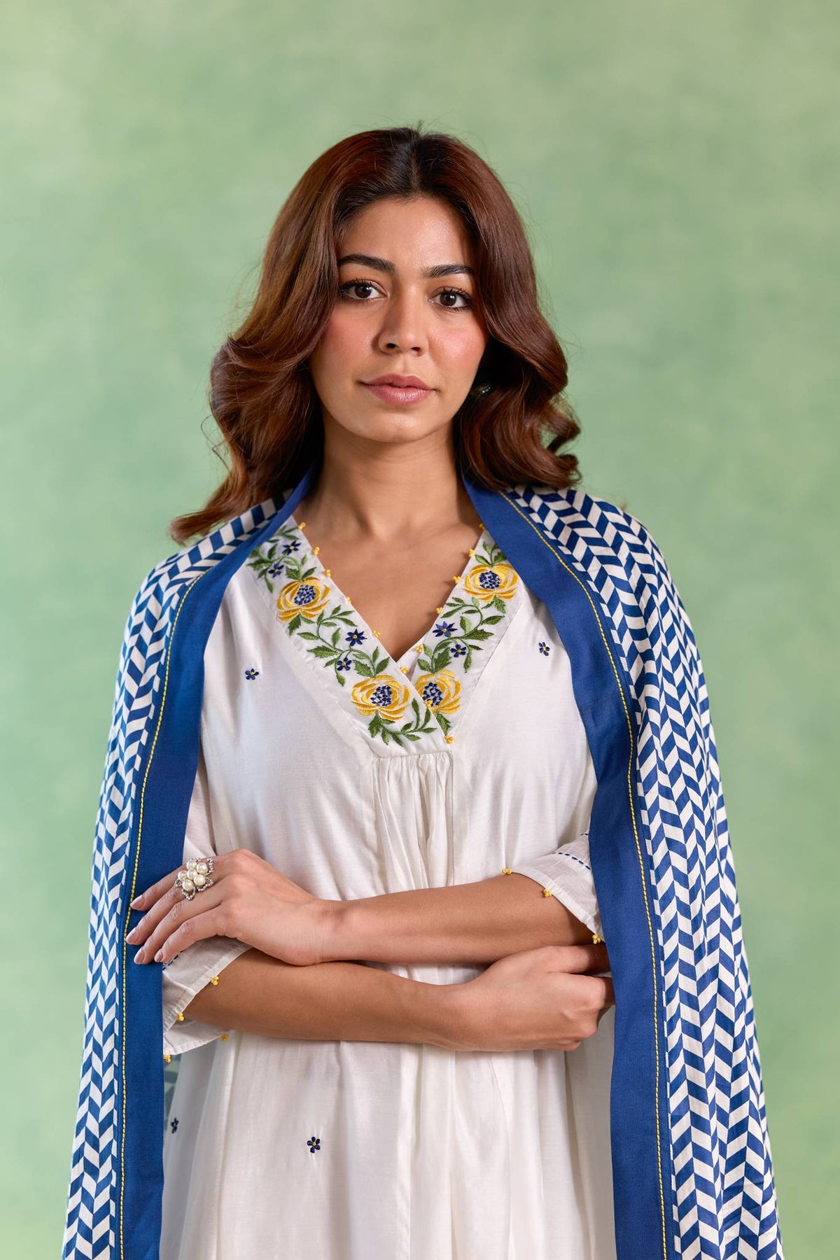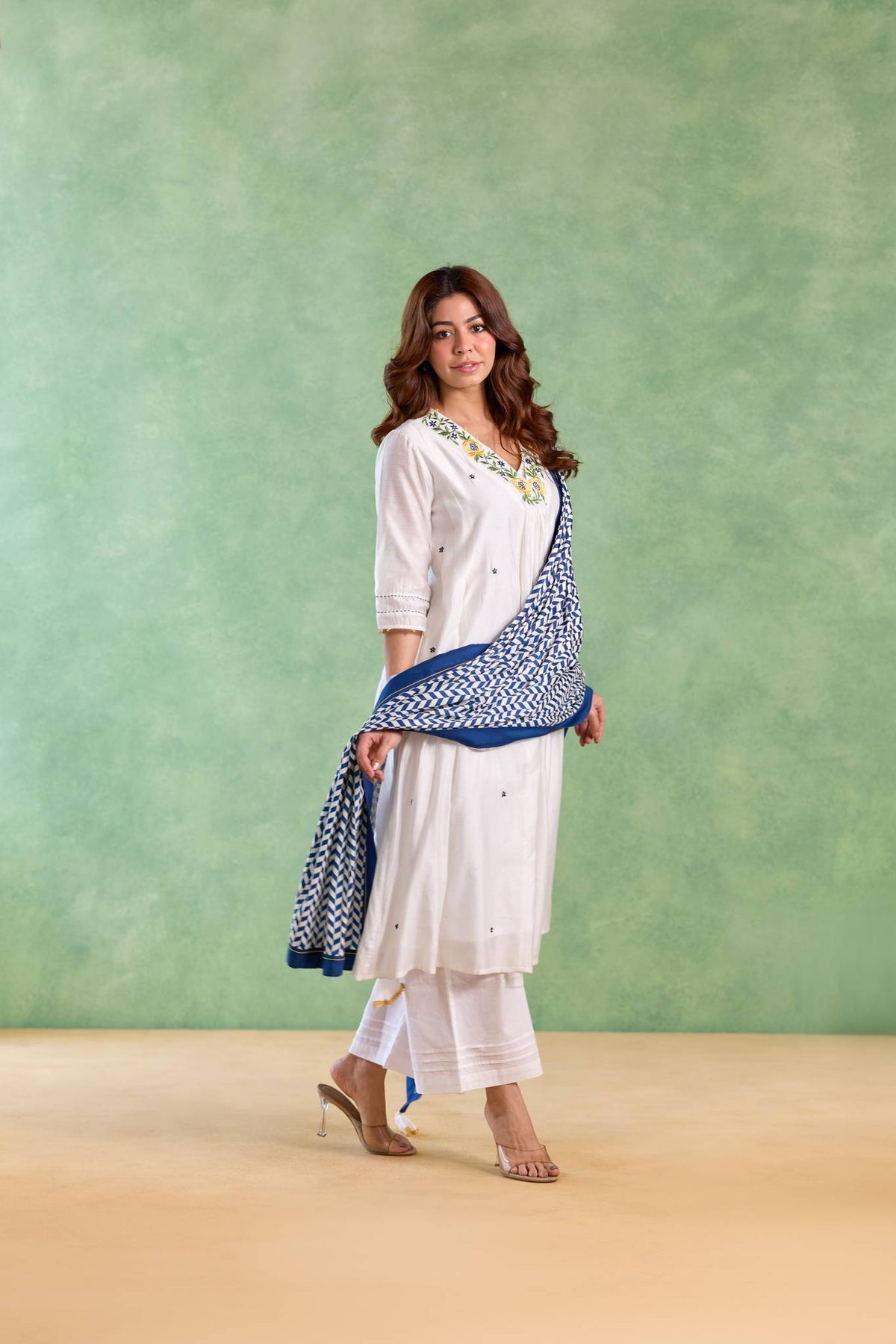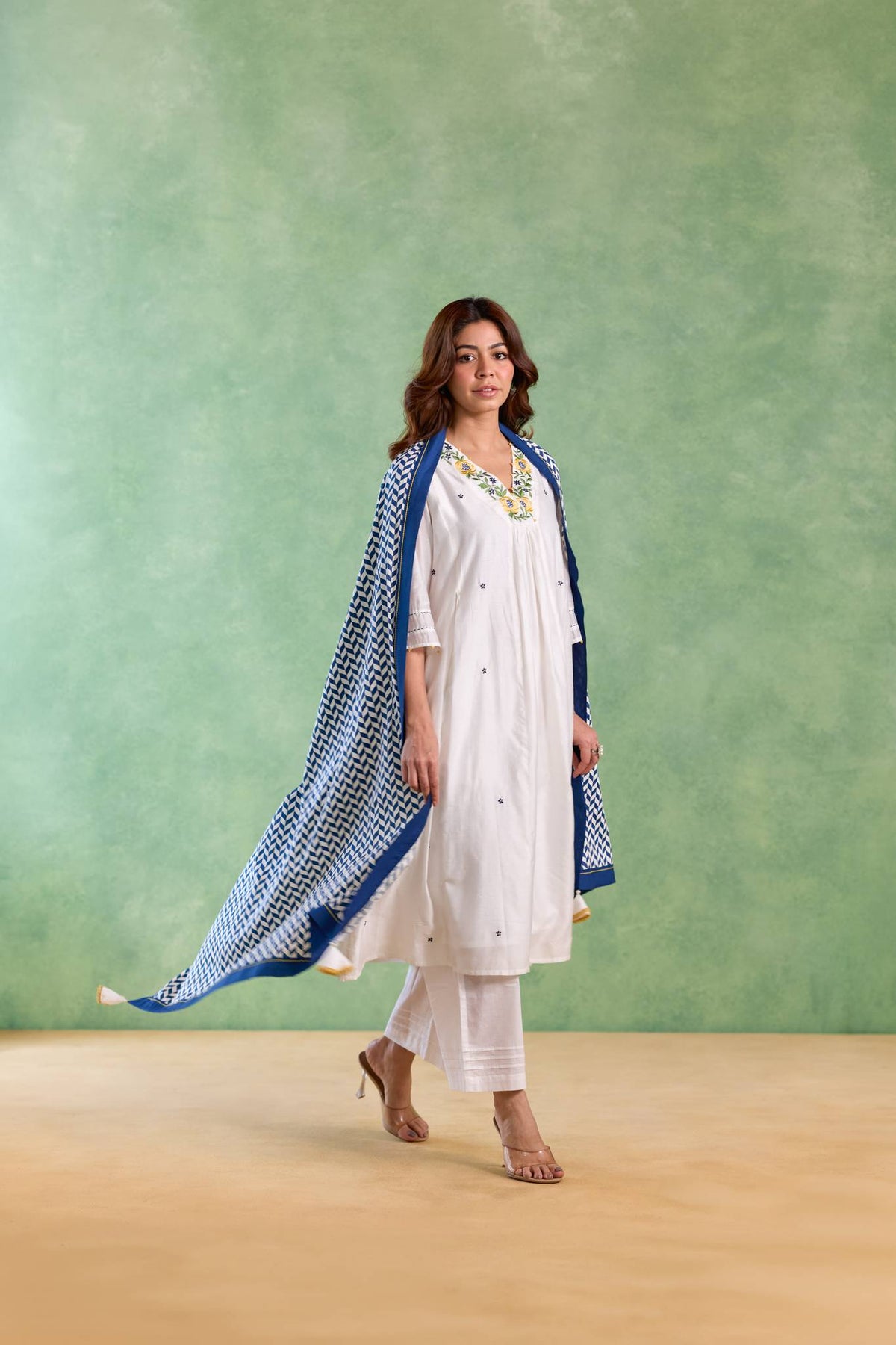 The Blue Petal Embroidered Kurta with Wide-Leg Pants and Dupatta showcases vibrant elegance with delicate petal-inspired embroidery on a white base. Paired with flowing wide-leg pants and a coordinated dupatta, the ensemble creates a graceful silhouette perfect for festive gatherings and special occasions.