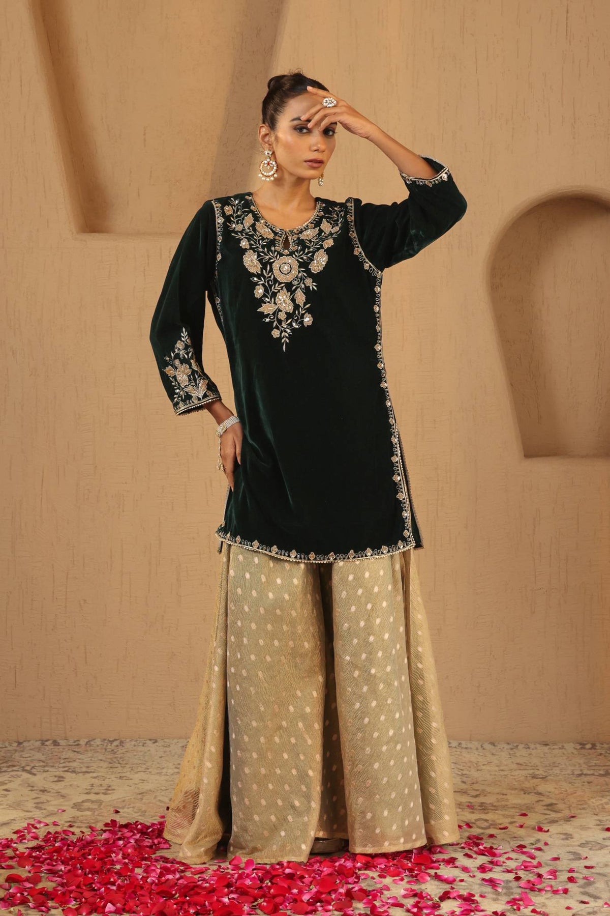 Radiating timeless grandeur, the Emerald Floral Zari Embroidered Velvet Kurta with Crush Tissue Dobby Sharara and Dupatta is a celebration of rich textures and exquisite craftsmanship. This luxurious three-piece ensemble is perfect for weddings, festive gatherings, and special occasions, blending traditional opulence with contemporary elegance.