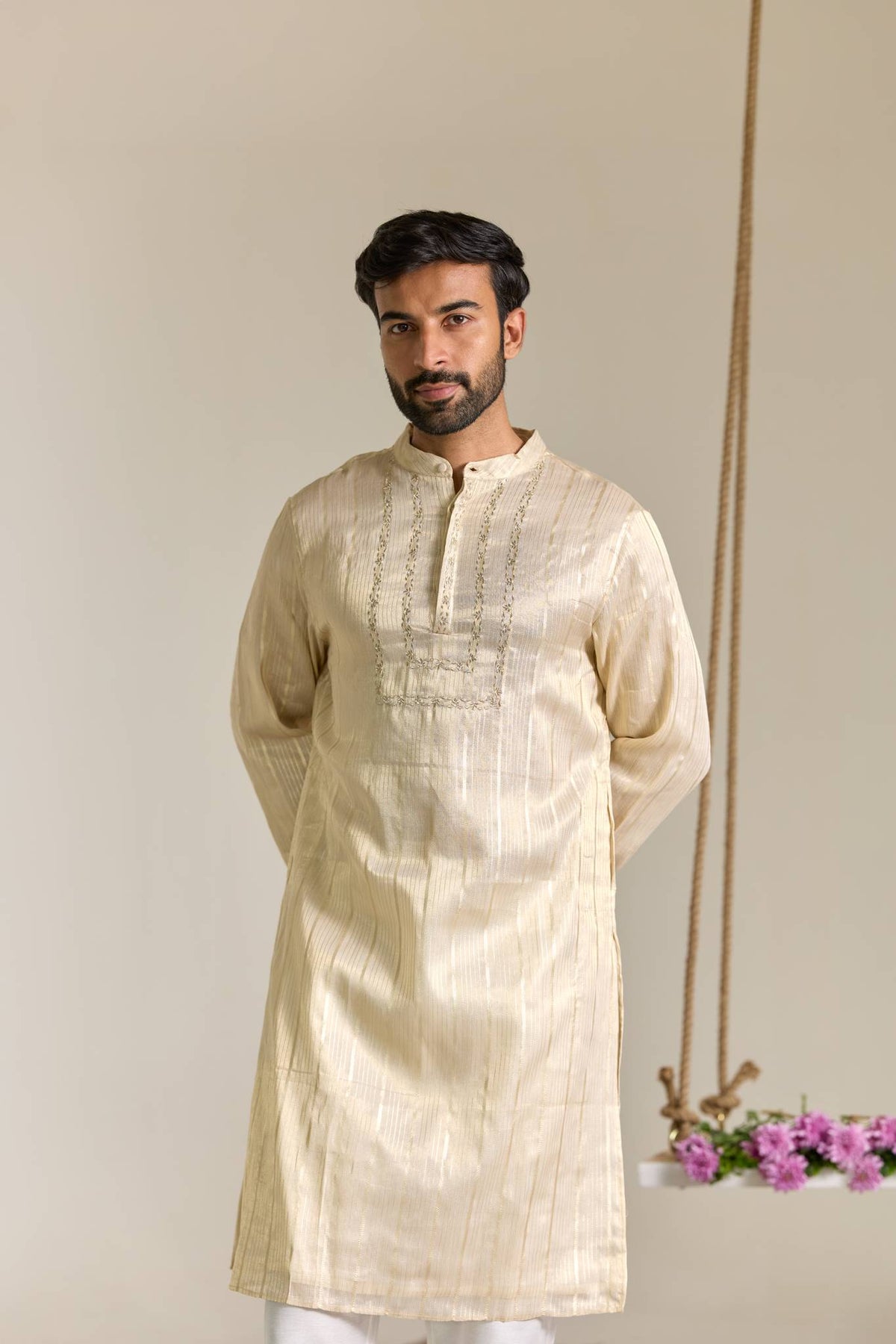 Featuring a warm golden tone, the Gold Yoke Raw Stripe Embroidered Kurta is adorned with refined raw stripe textures and detailed embroidery on the yoke, making it a graceful choice for festive gatherings, cultural occasions, and wedding functions.
