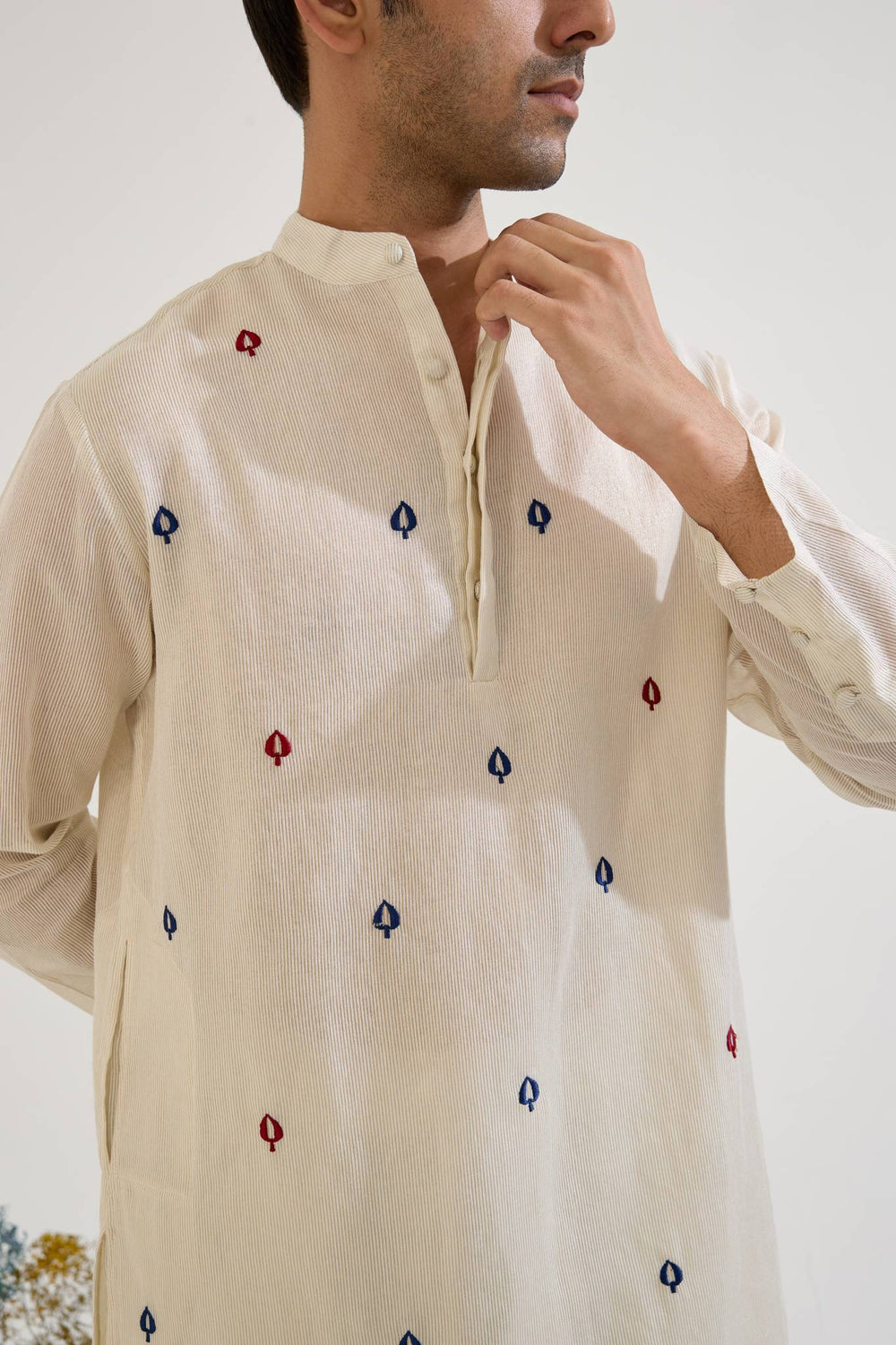 Crafted from soft, breathable Chanderi with a subtle stripe weave, the kurta features fine resham-embroidered butas that add delicate texture and detail. The classic ivory tone brings a sense of calm sophistication, while the straight silhouette and clean neckline ensure a modern, refined finish.