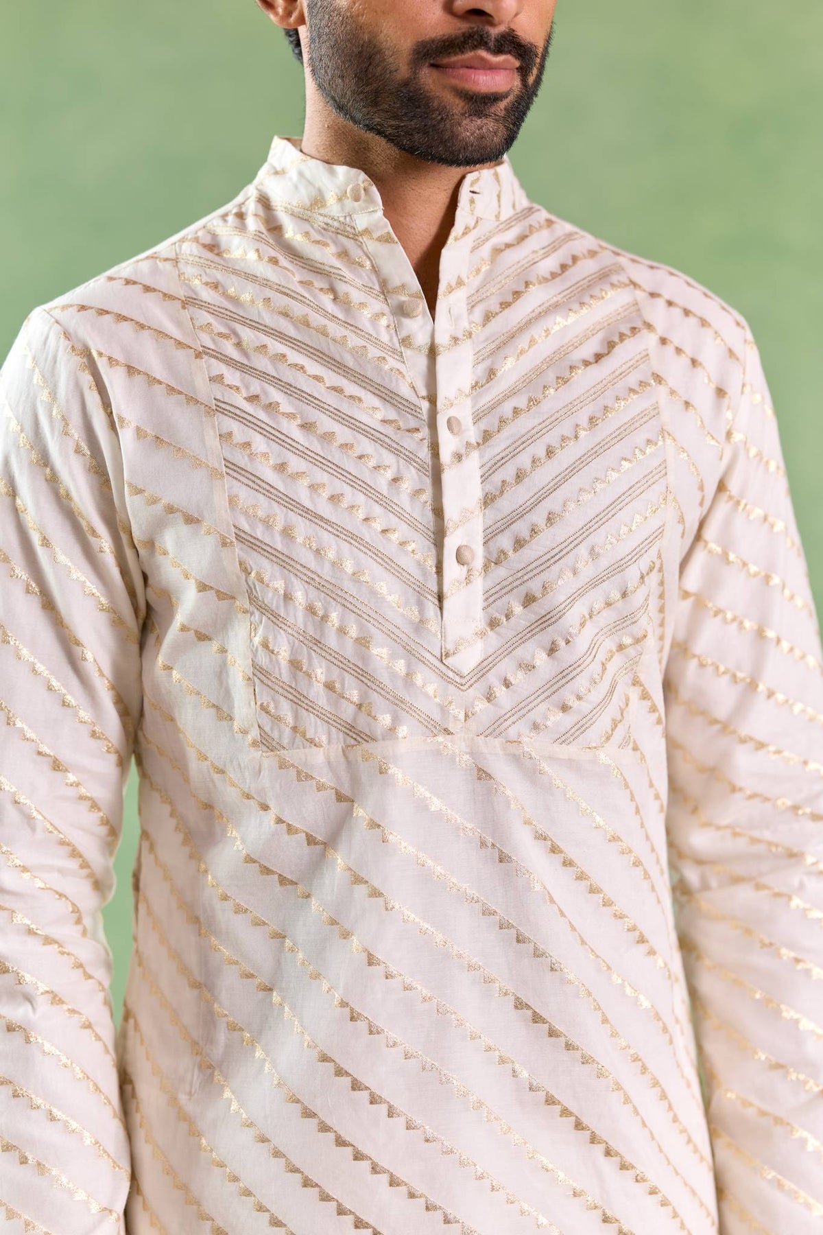 The Ivory Gold Chevron Chanderi Brocade Embroidered Kurta with Narrow Pants is crafted in rich Chanderi brocade, featuring elegant gold chevron patterns set against a classic ivory base. Intricate embroidery enhances the design, while the tailored narrow pants complete the ensemble with a refined and festive appeal.
