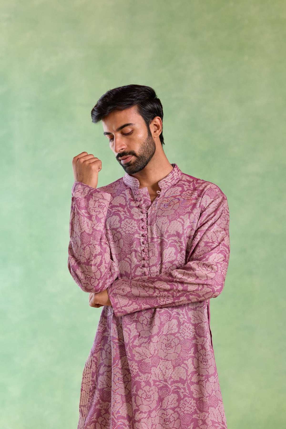 The Mauve Orchid Embroidered Printed Kurta reflects understated sophistication with its soft mauve tone and elegant orchid-inspired print. Enhanced with intricate embroidery detailing, the kurta creates a harmonious balance between modern design and timeless craftsmanship. Perfect for celebrations and intimate festivities, it offers a refined yet effortless look.