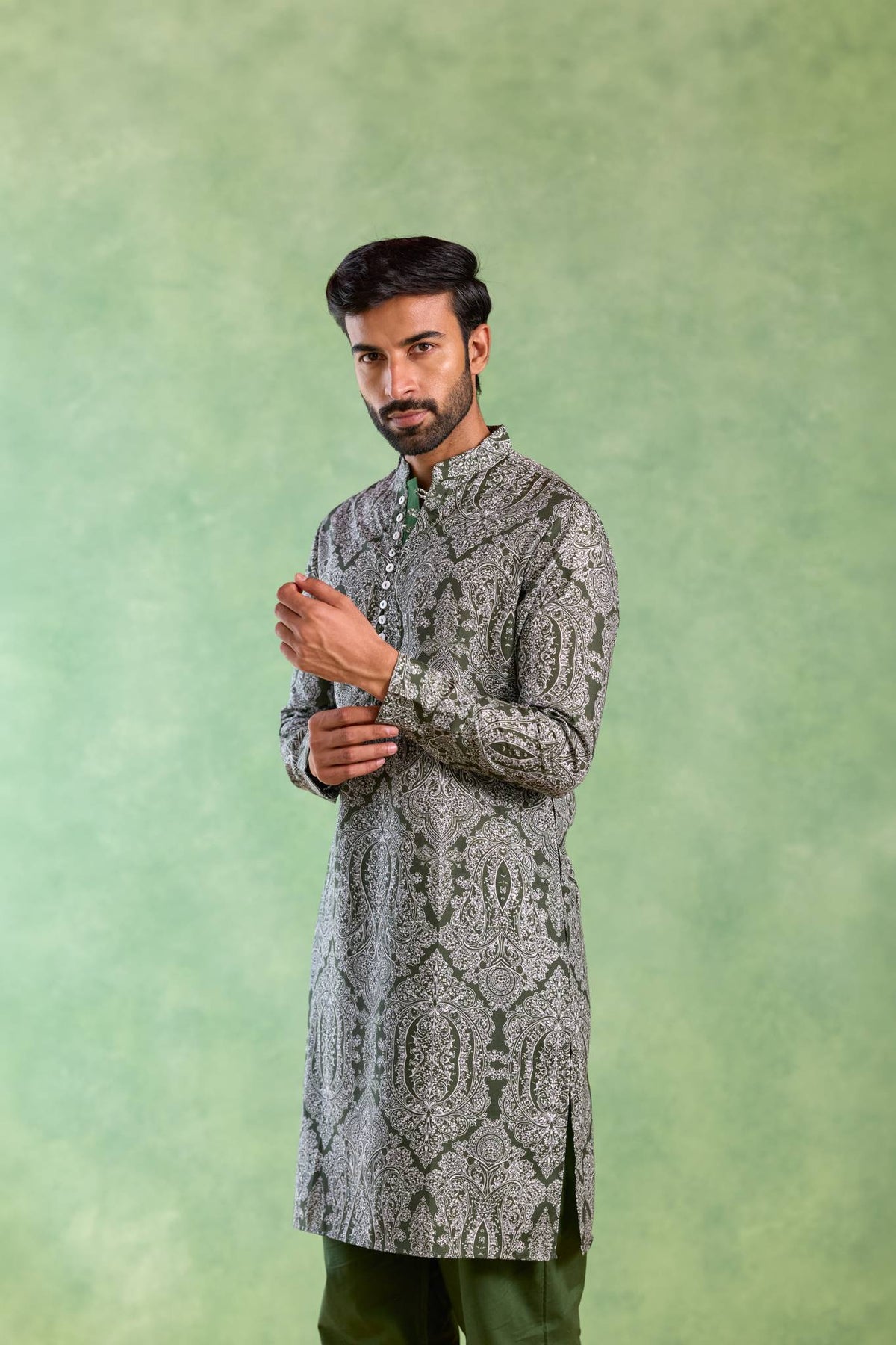 The Sage Floral Buta Embroidered Printed Kurta brings together soft elegance and intricate craftsmanship. Set on a refreshing sage base, the kurta features delicate floral buta prints enhanced with fine embroidery detailing, creating a refined and graceful look perfect for festive gatherings.