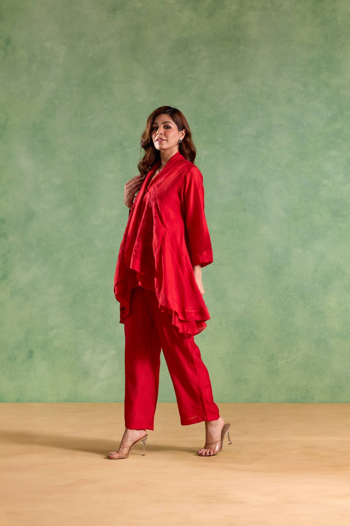 The coordinated slip provides comfort and smooth layering beneath the Chanderi kurta, enhancing the overall structure and ease of wear.