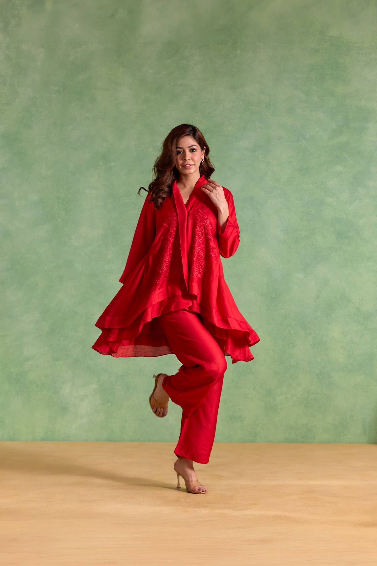 The Rosy Charm Embroidered Chanderi Kurta with Straight Pants and Slip features a chic layered short kurta crafted in elegant Chanderi fabric. Designed with soft tiered layers and delicate tonal machine embroidery, the ensemble blends contemporary styling with subtle festive charm, making it perfect for intimate gatherings and daytime celebrations.