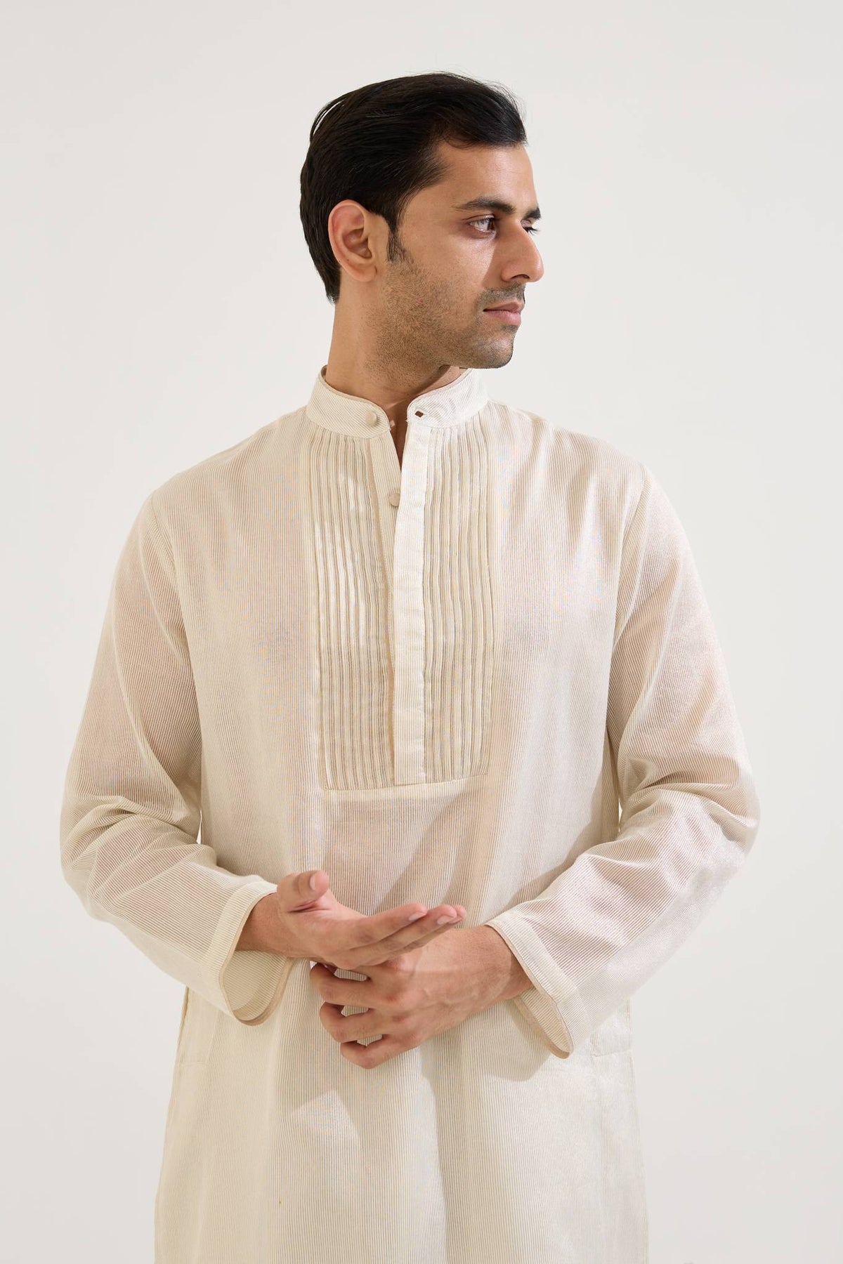 Chanderi with a subtle stripe weave, the kurta features a structured pintuck yoke that adds quiet texture and depth. The pristine white base is elevated with fine tissue piping along the neckline and sleeves, bringing in a touch of festive shimmer. The silhouette is clean and straight, ideal for both classic and contemporary styling.