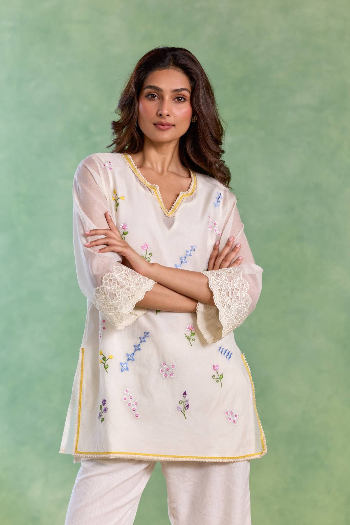 The White Spring Embroidered Mul Chanderi Handloom Linen Top is crafted in breathable mul Chanderi handloom linen and adorned with intricate multi floral embroidery, complemented by delicate floral lace accents. Paired with a coordinating handloom slip and tailored pant, the ensemble offers a fresh, elegant look perfect for daytime gatherings and casual dayout.