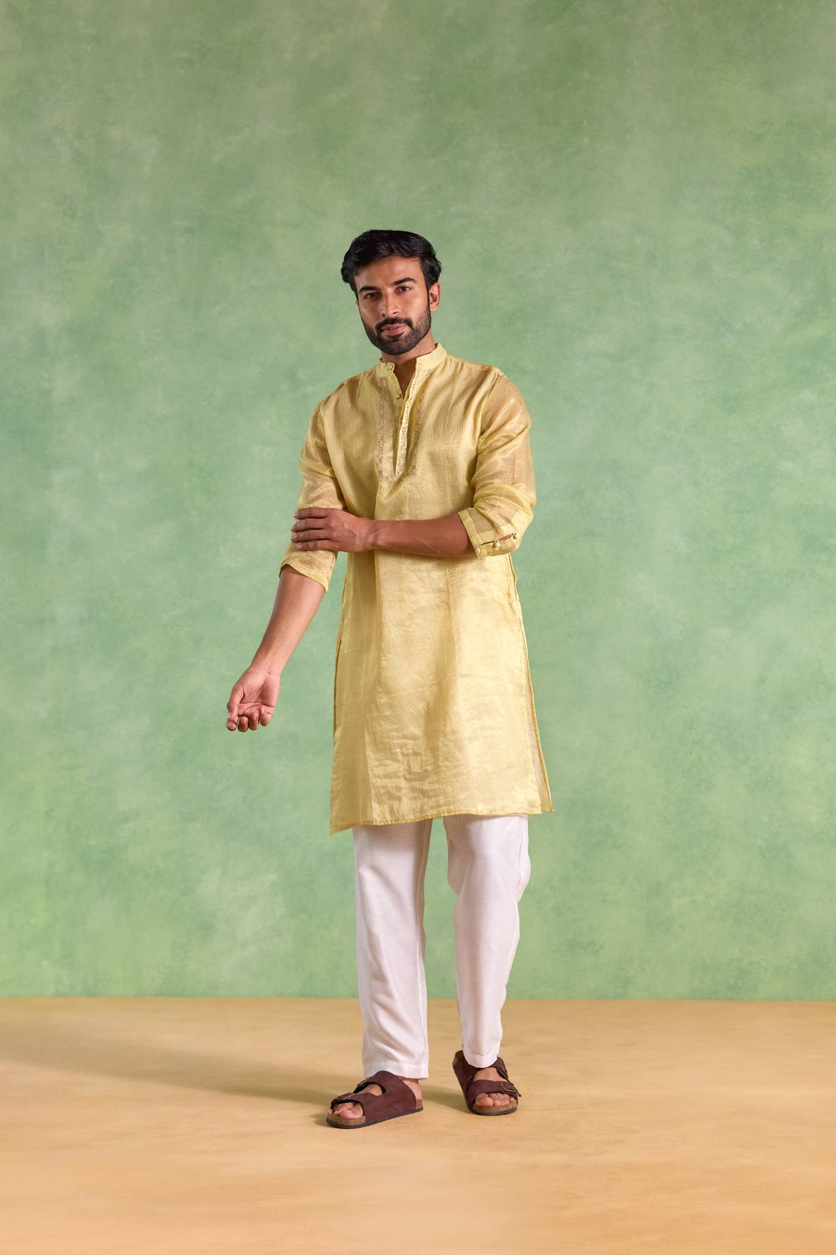 Crafted in lustrous Chanderi fabric, the Yellow Gold Chanderi Stripe Embroidered Kurta features graceful stripe patterns accented with intricate embroidery. The lightweight yet rich fabric adds comfort and sophistication, making it a stylish pick for festive occasions, cultural celebrations, and wedding festivities.