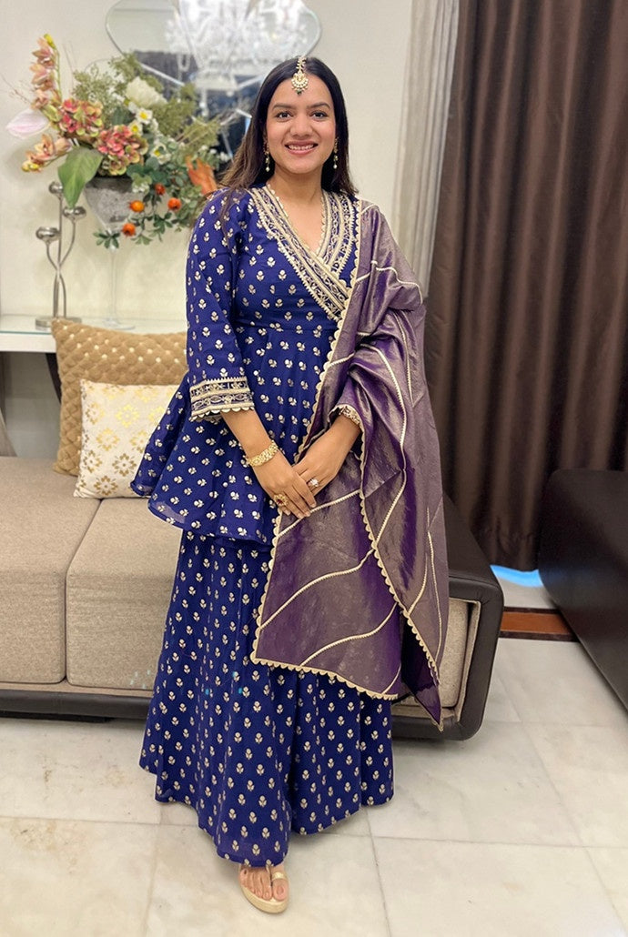 Crafted in a deep navy blue hue with a gota embroidered velvet yoke that adds richness and royal elegance.
