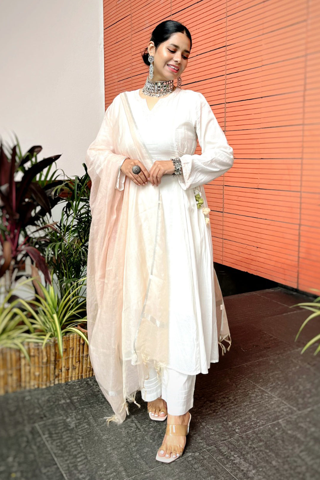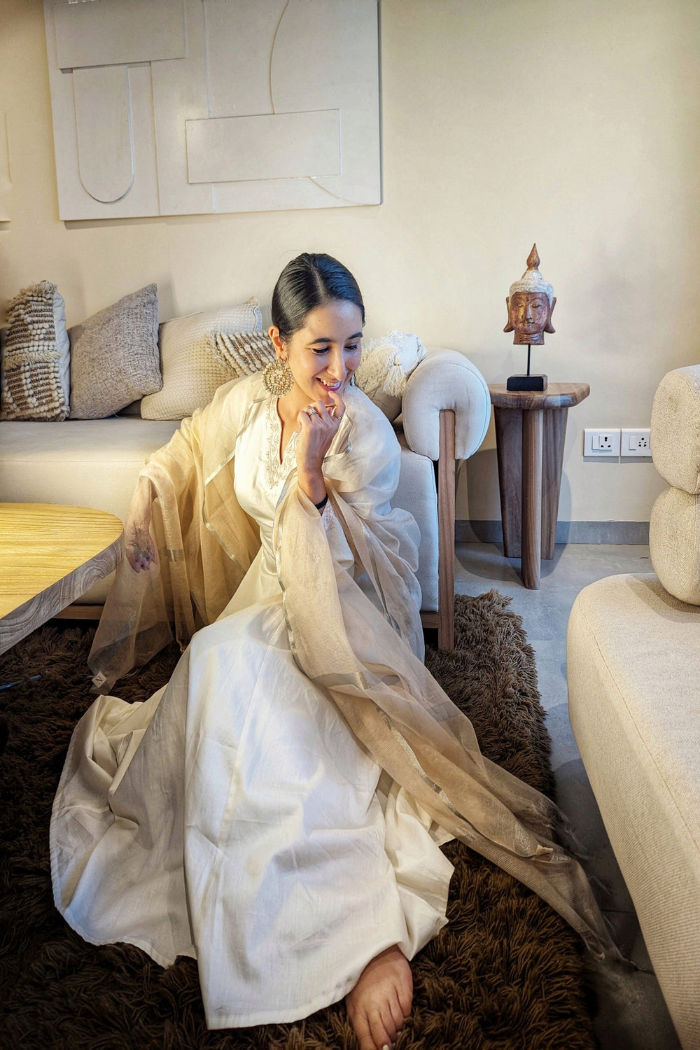 -Angrakha Kurta in Ivory Cotton Satin Fabric with side tie ups to adjust the waist.