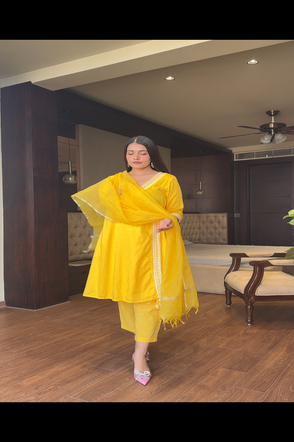-Angrakha Kurta in Blazing Yellow Cotton Satin Fabric with side tie up to adjust the waist.